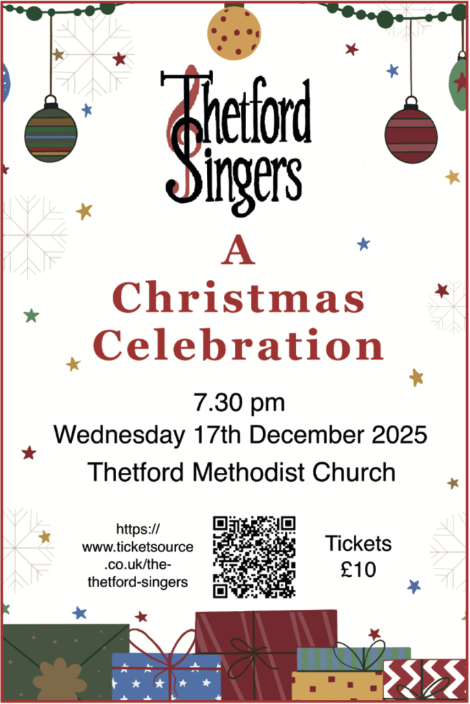 Thetford Singers return to the Methodist Church for their annual Christmas concert on Wednesday 17th December. It promises to be an enjoyable evening that will be especially poignant for their members – their last concert with their Musical Director and conductor, Chris Parsons.